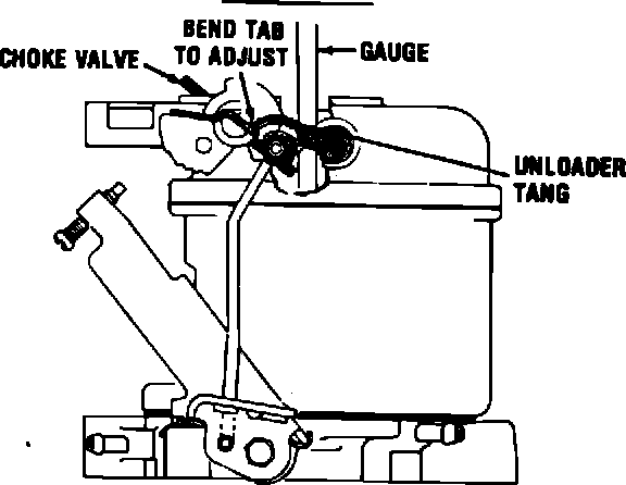 Hold the throttle valve in wide open position and close the choke valve as far as possible without forcing. There should be clearance as specified between the lower edge of the choke valve and the inner wall of the air horn. Adjust by bending the tab.