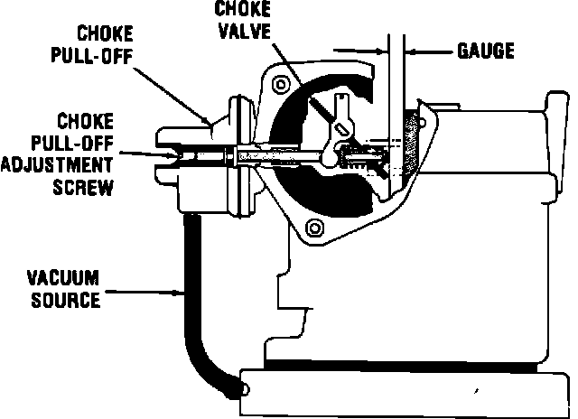 Seat diaphragm by using an outside vacuum source. Apply a light closing pressure to the choke valve to move the valve toward the closed position as far as possible without forcing. The dimension between the lower edge of the choke valve and air horn should be as specified. To adjust, use the adjusting screw located in the diaphragm housing. After adjustment is made, replace tamper resistant plug.