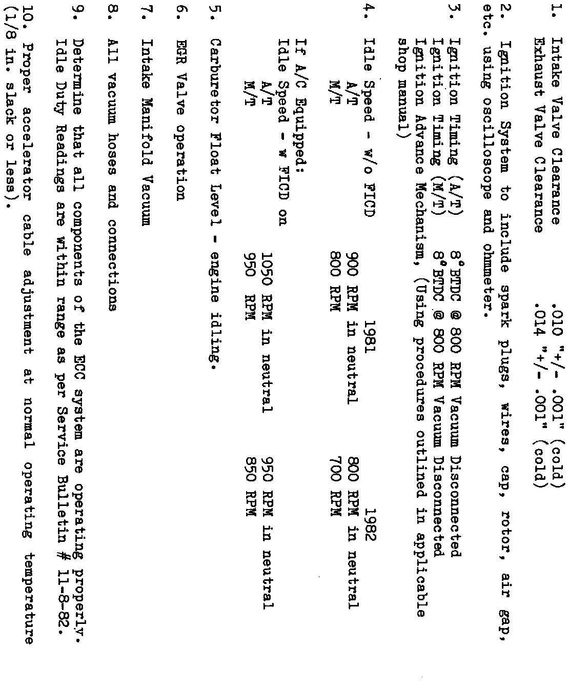Should you receive a complaint from a customer of a driveability condition in a 1981 or 1982 Subaru vehicle, it could be attributed to many factors. It will first be necessary to determine that the basic operating specifications of the vehicle are set properly.