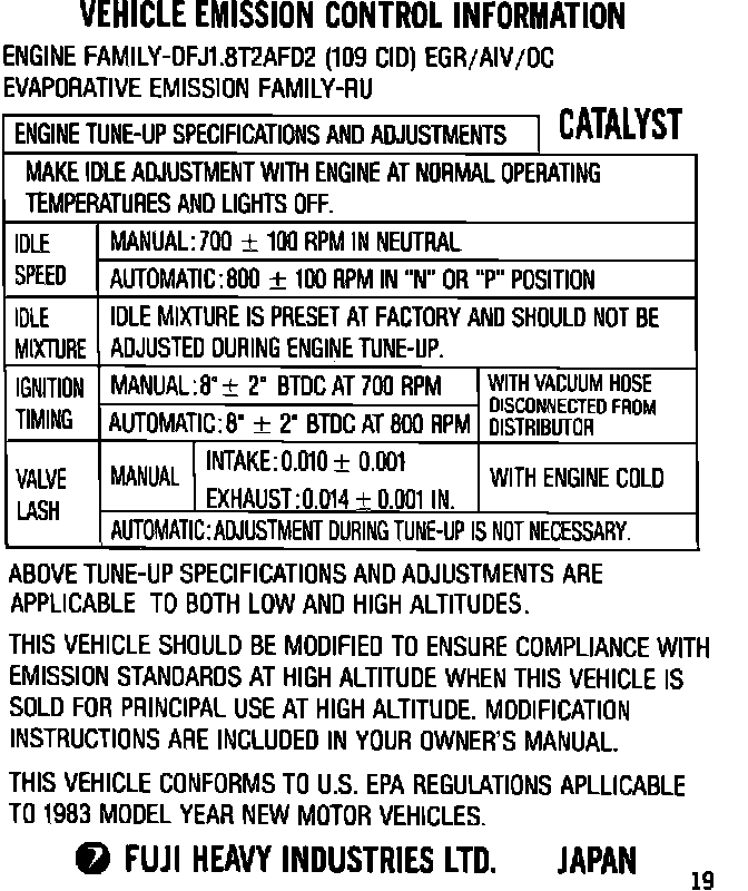 Should you need any other information on this subject, refer to the tune-up section in the 1983 Subaru Service Manual.