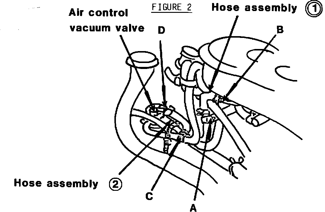 2) REMOVE HOSE ASSEMBLY 2 BETWEEN SECTION "C" OF CONNECTOR AND NIPPLE "D" OF AIR CONTROL VACUUM VALVE, AND THEN PLUG THE OPENINGS WITH RUBBER NIPPLES. (REFER TO FIGURE 2).