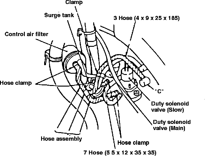 2) Remove the hose extending from the control air filter to the duty solenoid (slow) and remove the hose clamps.
