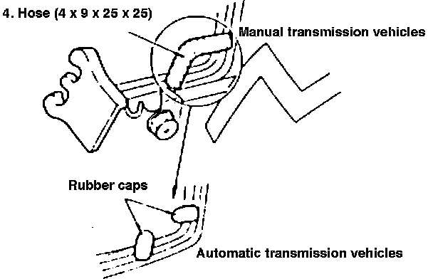 ^ Automatic transmission vehicles; Remove the two rubber caps as shown in Fig. 5, put the grooveless orifice, contained the orifice set (5), into the hose (4 X 9 X 25 X 25) (4), and install the hose to the same positions as the removed rubber cabs.