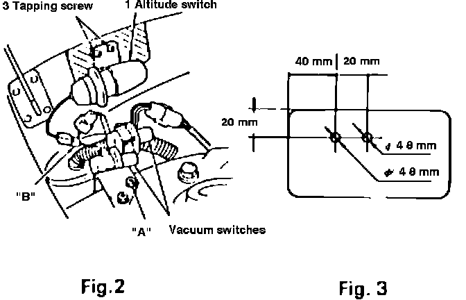 1) Install altitude switch (1) to the flat square section (hatched area in Fig.2) of the bulkhead behind R.H. strut mount by means of two tapping screws (3). Drill mounting holes (2 places) in advance as shown in Fig. 3.
