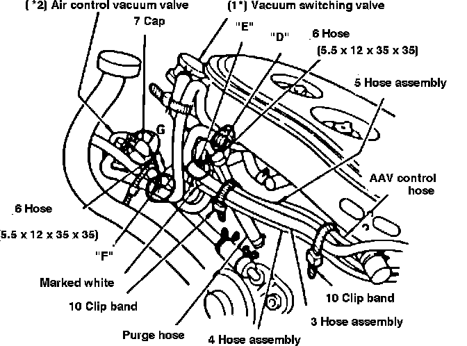 In the case of vehicles with former high-altitude kit (483337400) already mounted, remove the hose connecting between the nipple "D" and the connector section "E" and the hose connecting between the connector section "F" and the air control valve section "G" instead of per - forming step 1) above. In addition, fit the cap (7) to the air control section "G".