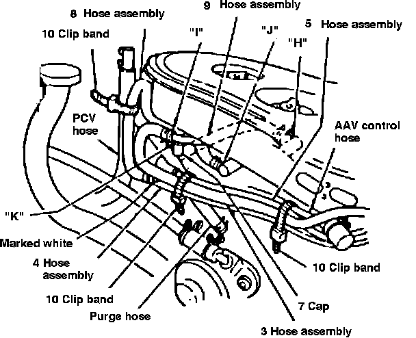 In the case of vehicle equipped with former high-altitude kit (483337400), remove the hose connecting the nipple "H" with the nipple "I" and the hose connecting the nipple "J" with the nipple "K", instead of performing step 1) above. In addition, put the cap (7) to the nipple "K".