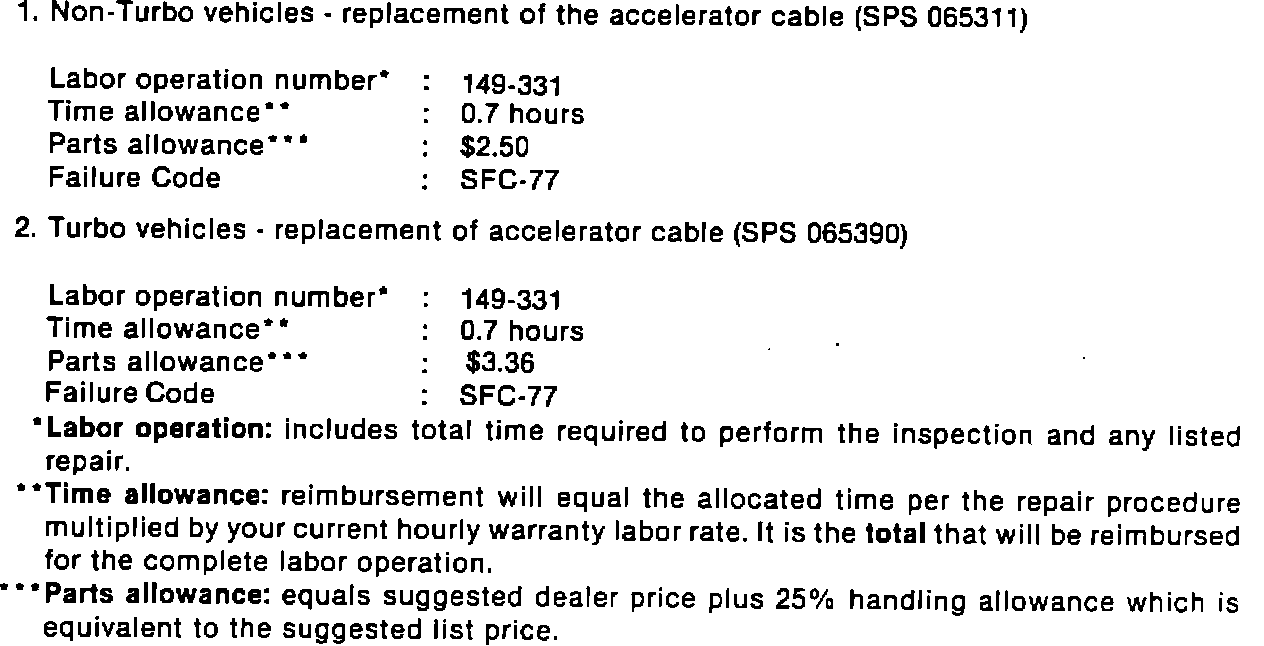 Credit for the performance of the inspection and bracket alignment or clamp installation for non-Turbo or Turbo vehicles respectively, will be provided from the Recall Certification/Repair Order Form. Credit for accelerator cable replacements on either non-Turbo or Turbo vehicles will be made from an MSA-400, Dealer Claim for Credit accompanied by the Recall Certification/Repair Order Form. Therefore, it is very important that all of the information on the form be complete and correct.