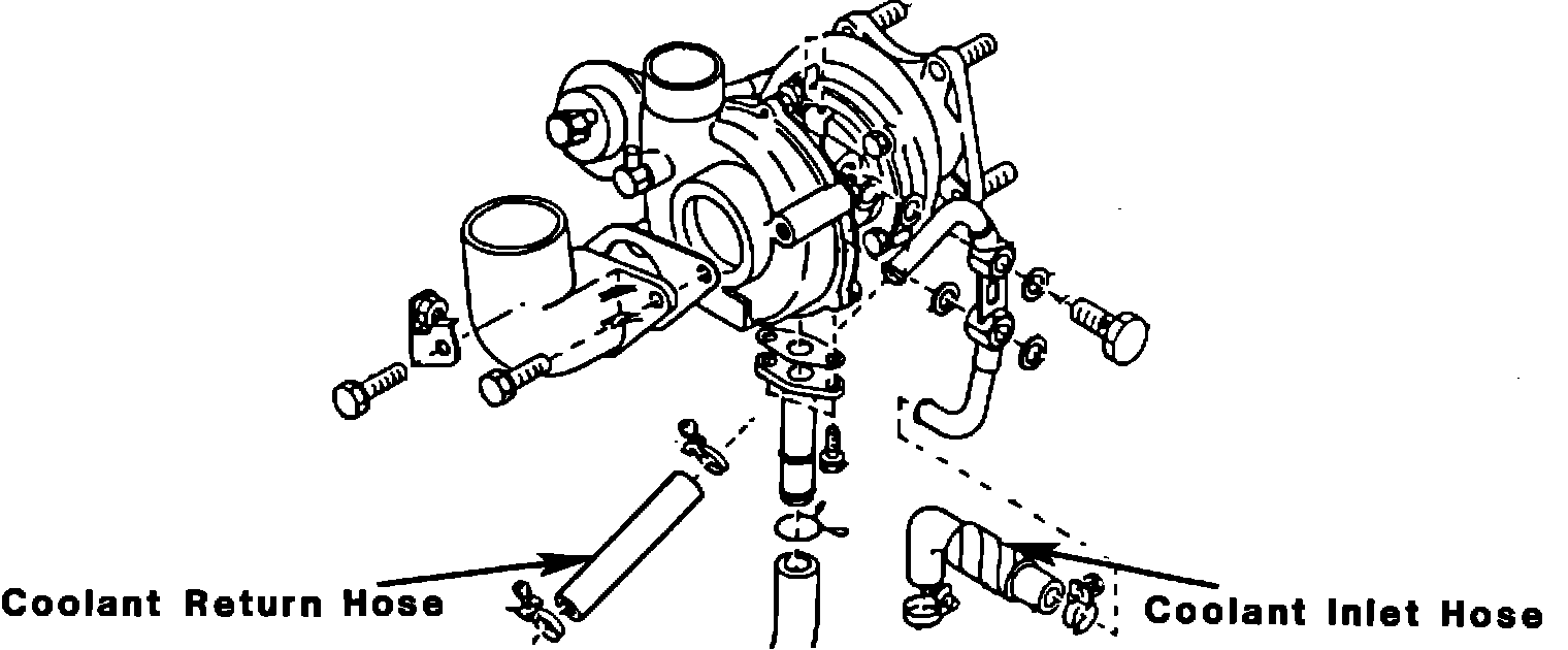 Hoses such as those carrying coolant to and from the turbo charger may be easily neglected because of their location. The coolant inlet hose is covered with a heat shield making it more difficult to inspect. The easiest way to inspect this hose is from underneath the vehicle. Leakage at this hose can result in extensive damage to engine and turbo charger if left unattended. See Figure.
