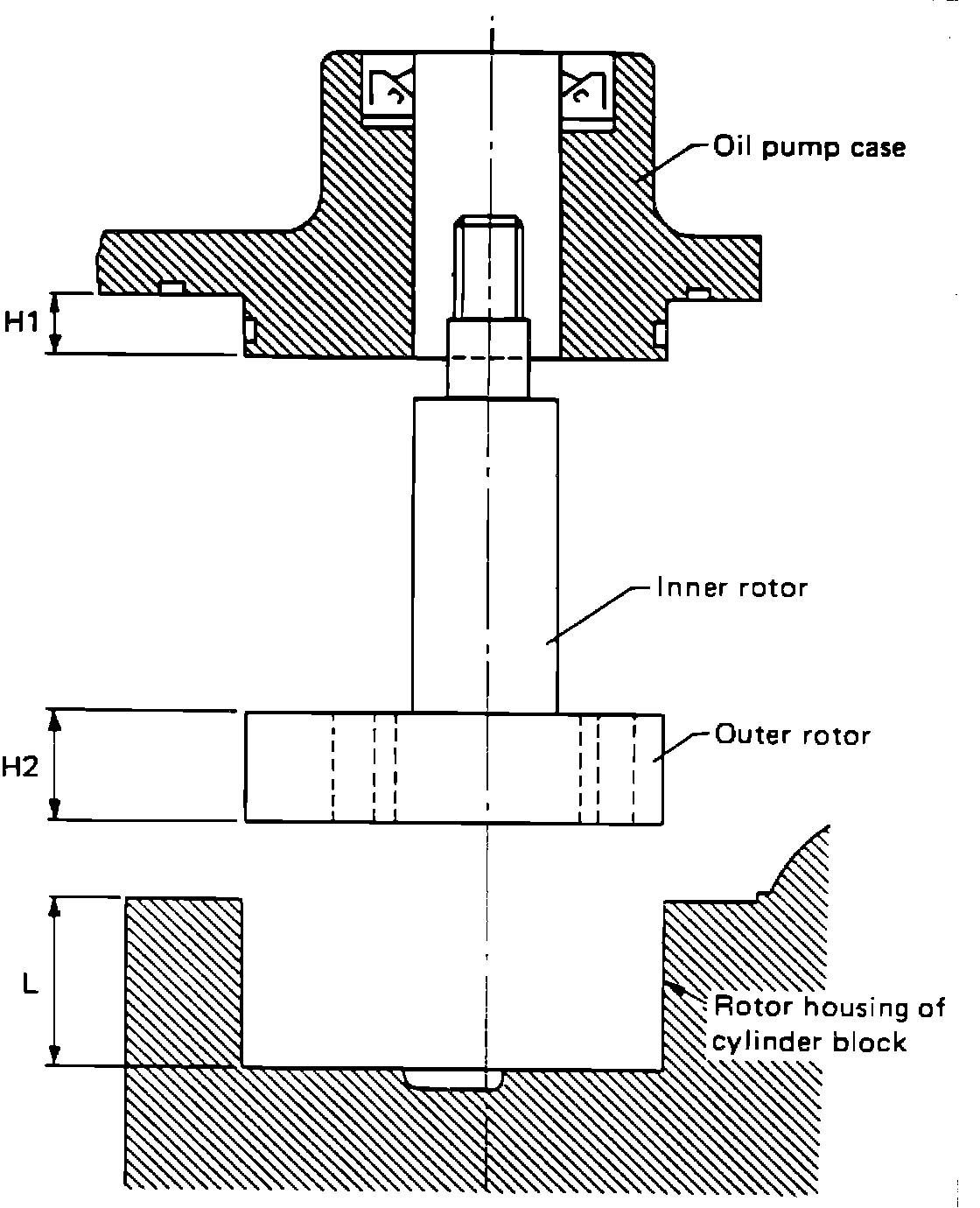 1. Measure total height of case projection (H1) plus oil pump inner and outer rotors (H2).