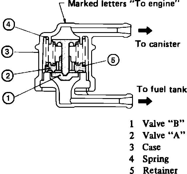 As the engine speed increases, the purge valve opens. The absorbed vapor is drawn from the canister into the intake manifold through the open purge valve and purge hose. While the purge valve is open, fresh air is drawn into the canister through the bottom filter, purging the absorbed vapor from the charcoal. When the engine is not running, the purge valve is opened by the return spring but the vapor remains in the canister because there is no vacuum to draw the vapor out.