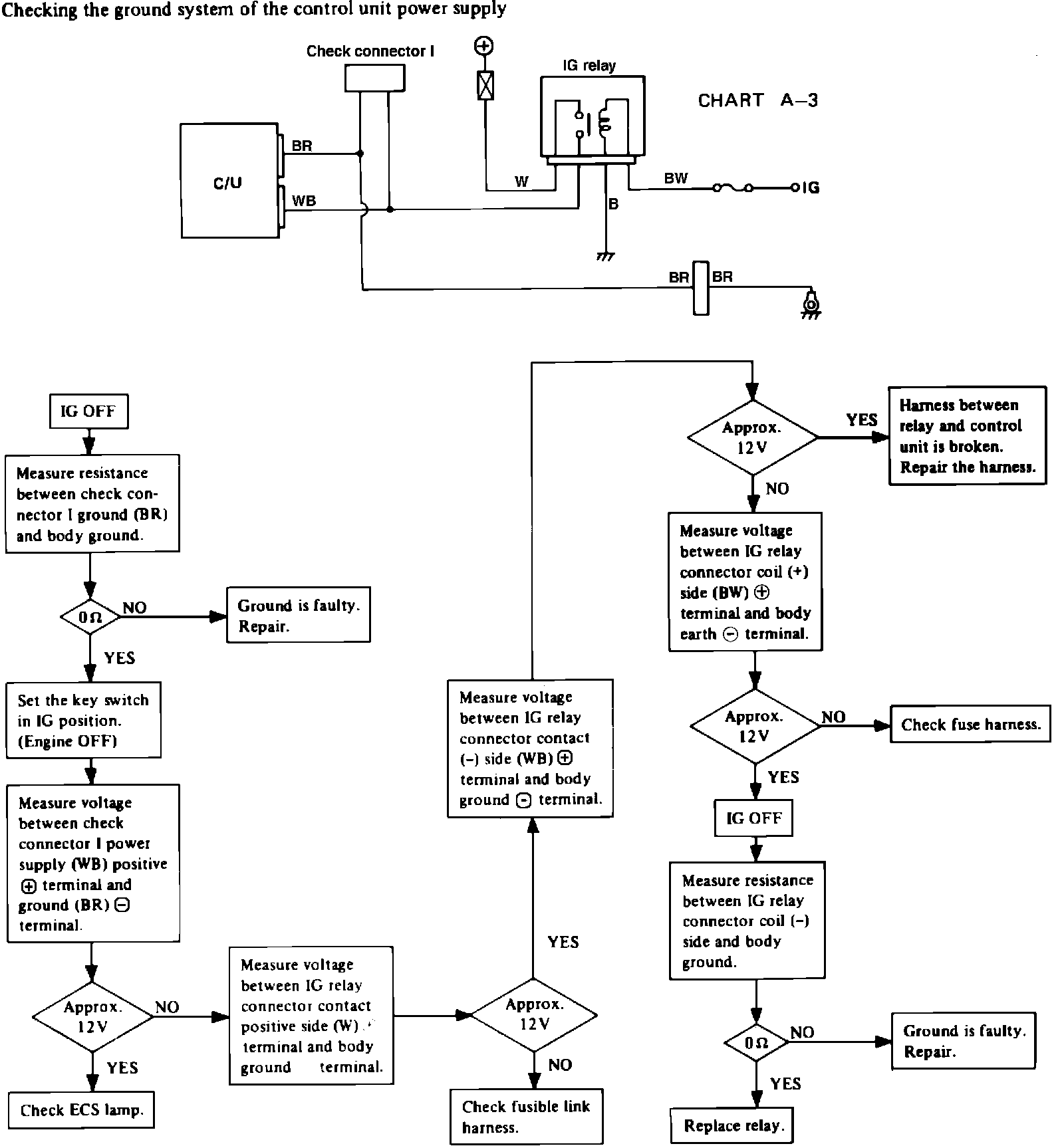 Fig. 1 EGI system troubleshooting chart. Checking ground of control unit power supply.: