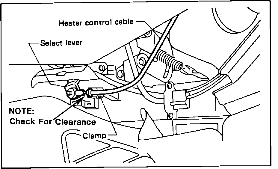 6) To adjust the cable, first disconnect the cable sleeve from the clamp on the heater box and remove the cable end from the select lever next to the accelerator cable.