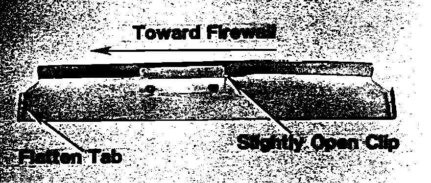 6) Install the baffle plate with the clip on the upper edge of the heater box with the end previously modified in STEP 3 toward the firewall.