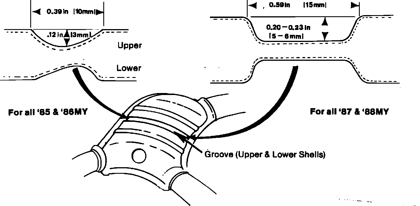 If the Y pipe has a weld-on cover shield, it's either a 1985 or 1986 pipe. If the pipe has a bolt-on cover shield, it could still be a 1985 or 1986. With the catalytic cover shield removed, the indentation on the catalytic converter can be used to provide positive indentification. 1985 and 1986 Y pipes had a narrow, shallow groove located on the upper and lower halves of the converter. 1987 and 1988 Y pipes use a slightly deeper, wider indentation with more squared off sides and flat bottom. (See Figure A)