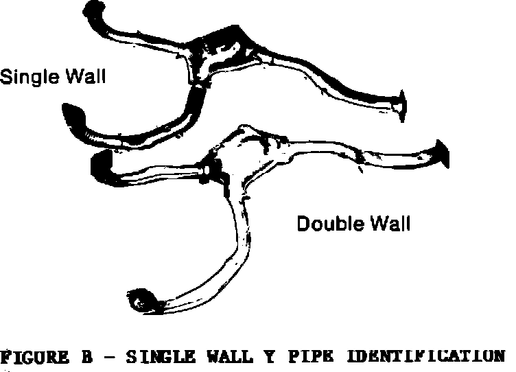 The difference between double wall and single wall Y pipes is that the single wall Y pipe incorporates shielding on the connecting pipes as well as the catalytic converter itself. Single wall Y pipes were incorporated in production in mid 1988. (See Figure B)