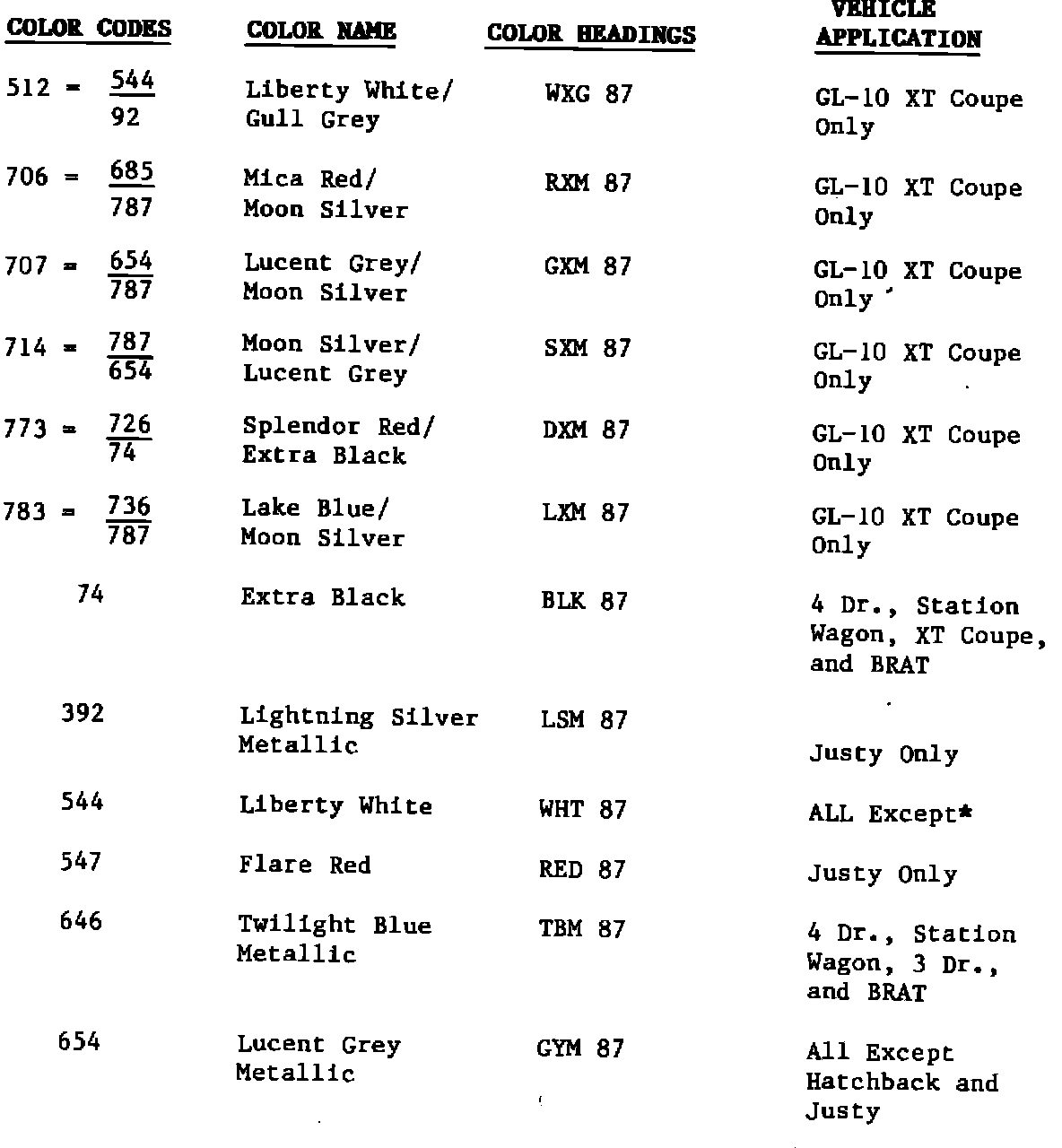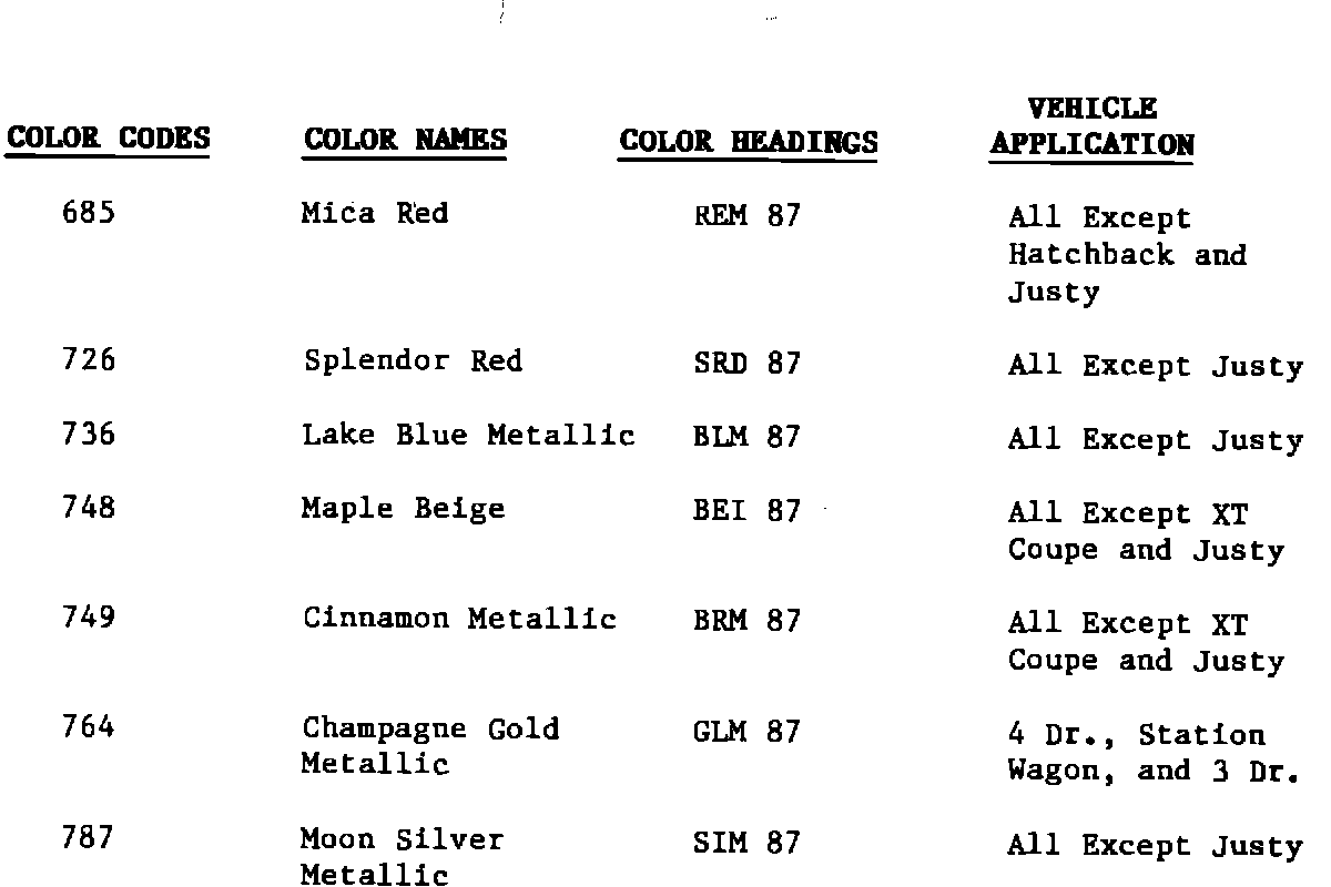 NOTES: 1987 MY JUSTY DL IS AVAILABLE ONLY IN COLORS #547 FLARE RED, AND #544 LIBERTY WHITE.