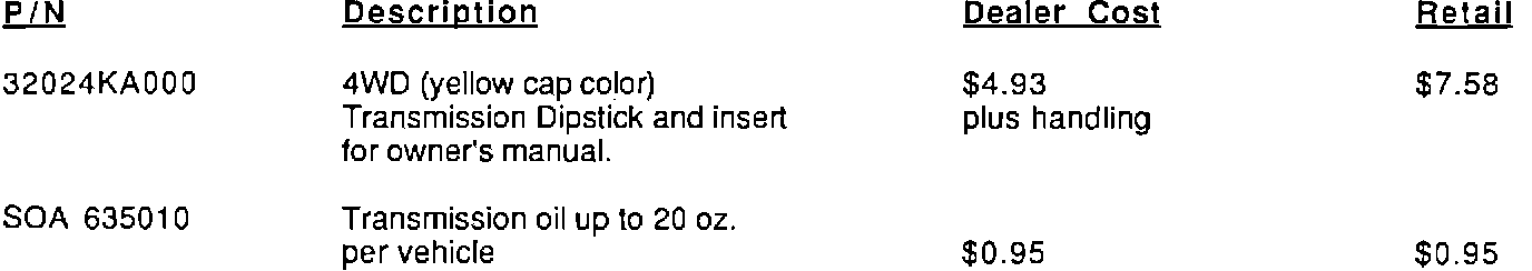 Each Subaru Dealer will receive with this bulletin 2 units of the replacement (yellow cap color) transmission case dipstick P/N 32024KA000 for use as special tools for Phase I action.Transmission oil (GL-4 or GL-5) should be obtained locally.
