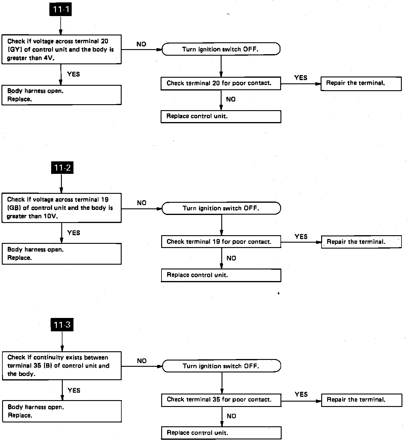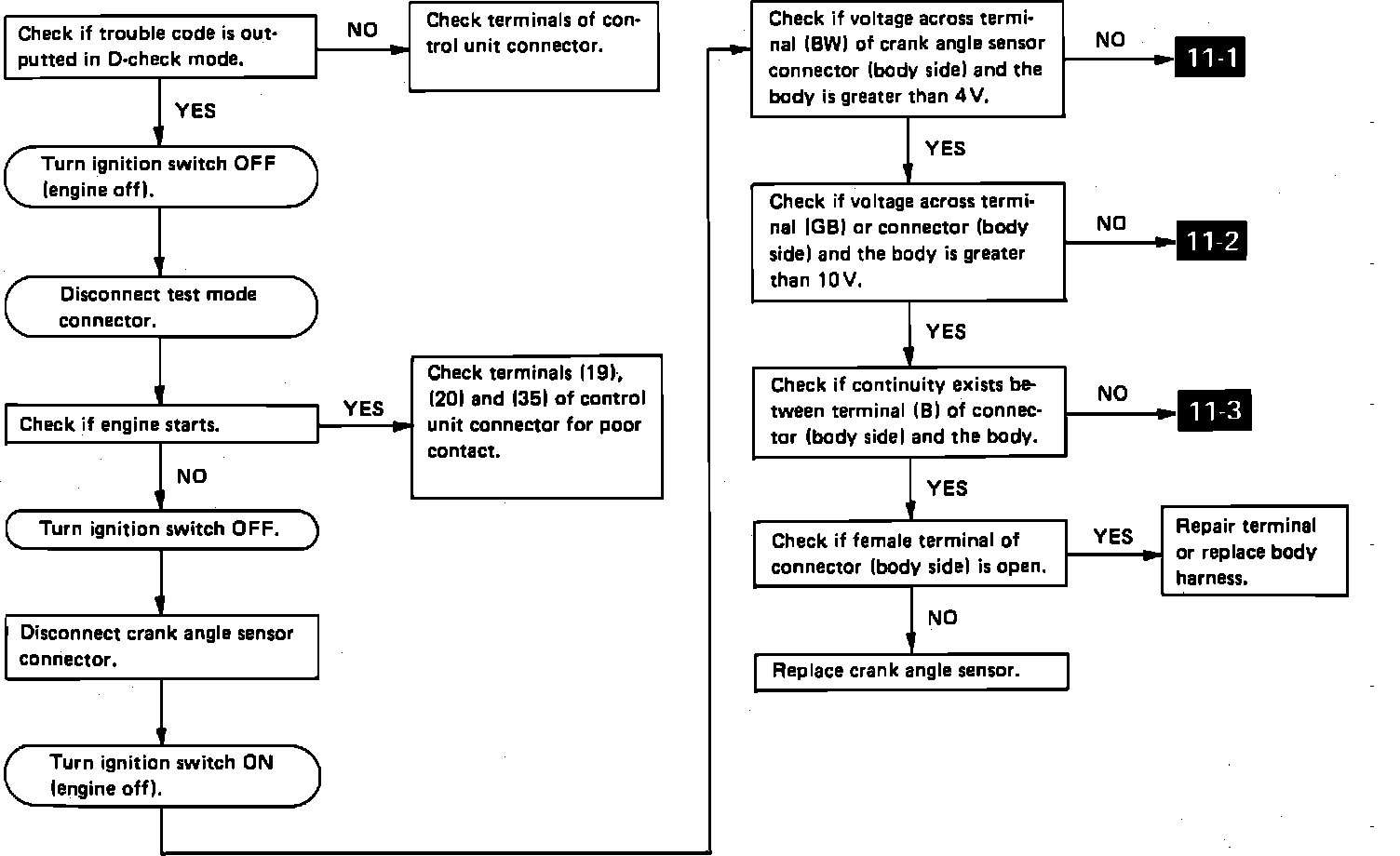 No reference pulse from the crank angle sensor will set code 11 in the on-board diagnostic system. Refer to the schematic diagram and test the sensor with the diagnostic chart.