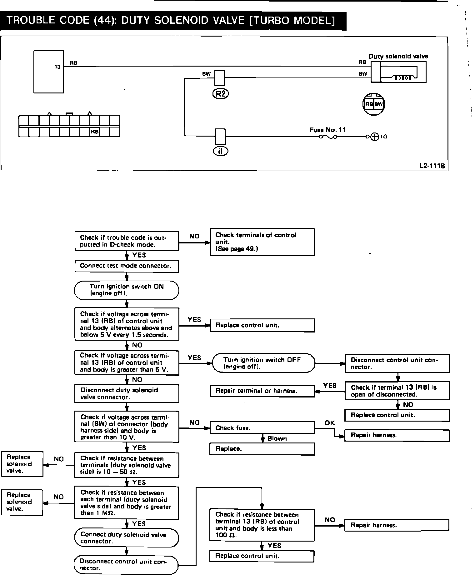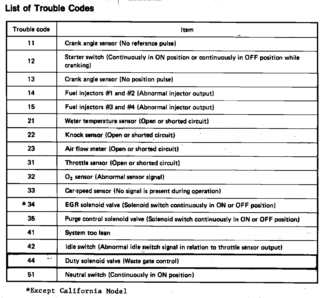 Please add Trouble Code 44: Duty Solenoid valve (Waste Gate Control) to the list of trouble codes found in section 2-7, page 99 of the 1988 "L" Series Subaru Service Manual. See figure 1. This Bulletin includes the Trouble Code 44 Diagnostic Trouble Shooting Chart. See figure 2 on back of this page.