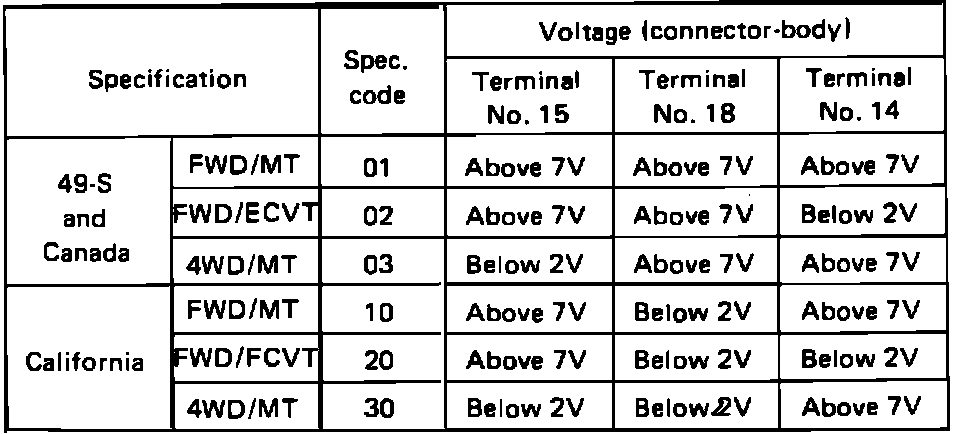 5. Check if specification code coincides with vehicle specifications. If not, measure voltage between ground and the indicated terminal of the control unit connector.