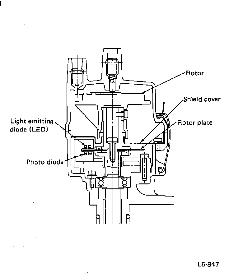 The distributor is operated by the left camshaft. The distributor has a shaft that is connected to the cam. This shaft turns at the same speed as the cam. Mounted to the top of this shaft is the distributor rotor. Mounted to the top of the distributor housing is the distributor cap. High volatge enters the center electrode in the distributor cap and is conducted to the center elctrode of the distributor rotor. As the rotor turns, voltage passes through the rotor and to the nearest output electrode of the cap. It then passes through the igition wire to the spark plug. This distributor is equipped with an optical crank angle sensor. Refer to COMPUTERIZED ENGINE CONTROLS for description and operation.