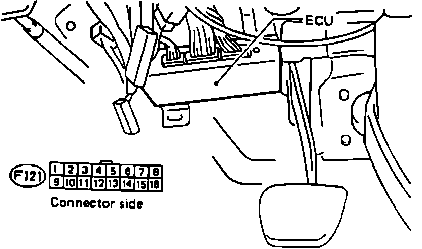 3. Measure resistance between ECU connector terminal (F121)6 and ground. It should be infinite.