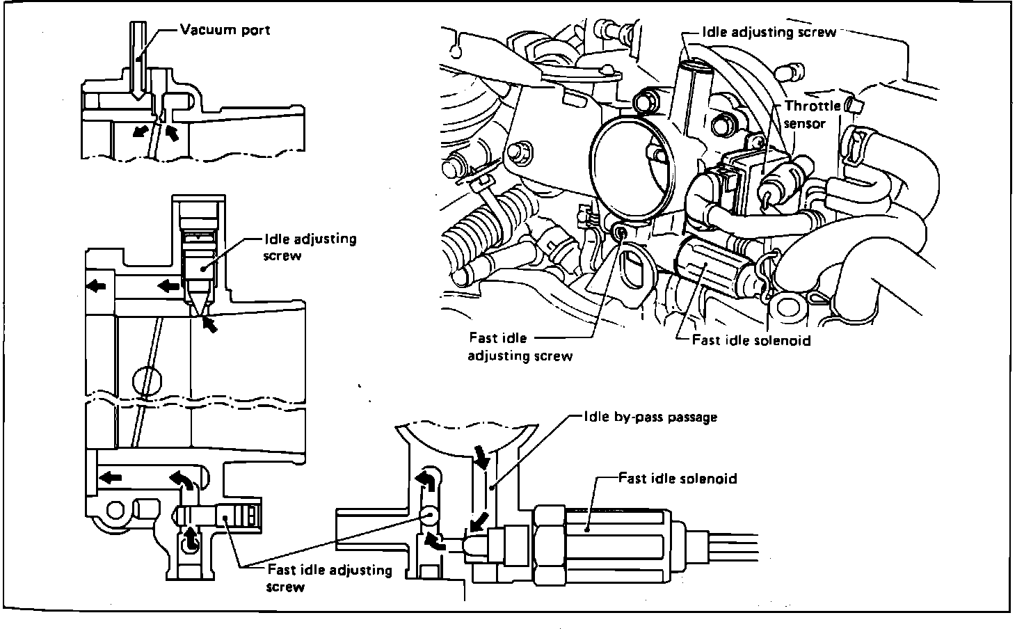 When the A/C compressor is turned ON, the ECU responds to the increased engine load by energizing the fast idle solenoid. When energized, the solenoid opens an idle bypass passage, allowing additional air around the throttle valve and raising the idle speed. An adjusting screw regulates the amount of bypass air. A faulty fast idle solenoid does not set a trouble code.