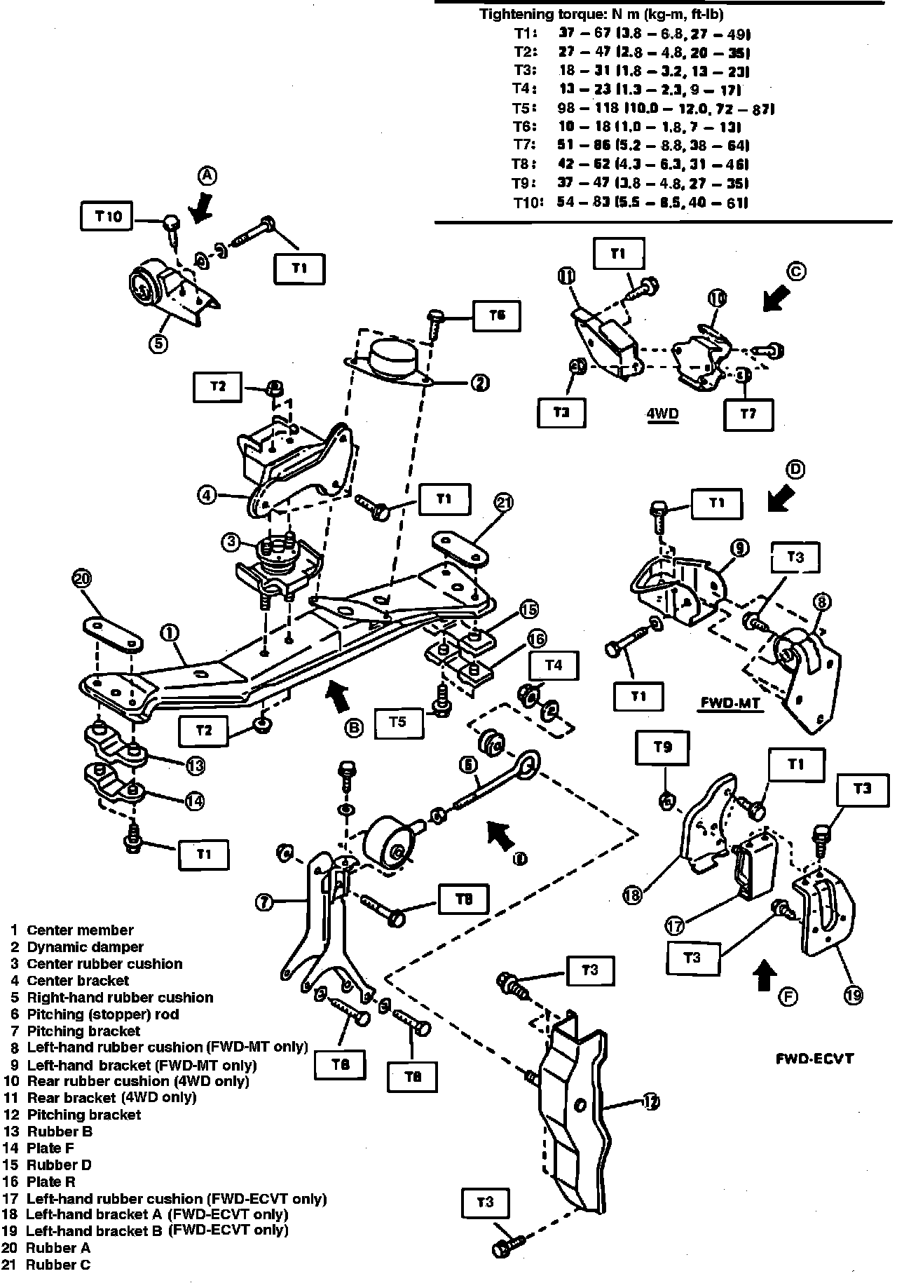 20. Remove rear transmission hanger, then raise and support vehicle.