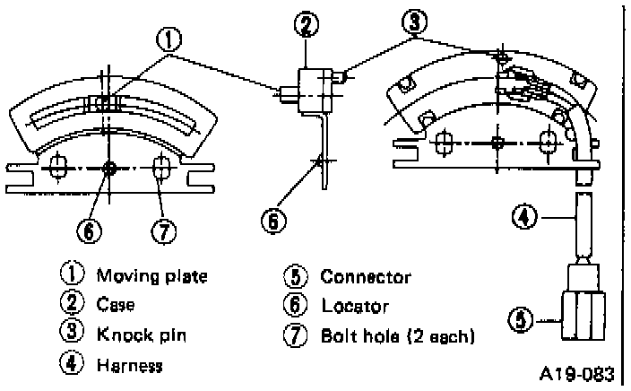 2. At the position where the selector lever is shifted in the "N" range and pushed to the "P" side lightly, match the locator to bracket hole, the moving plate pin to arm hole, then tighten the bolts to the specified torque.