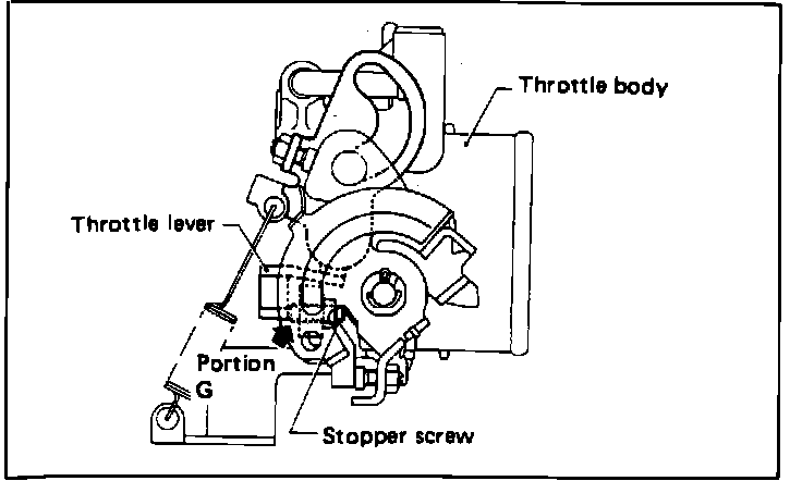 2. Insert a thickness gauge (0.35mm, 0.0138in) between throttle body stopper screw and stopper (portion "G"). Resistance between terminals "3" and "4" should be 5k ohms maximum.