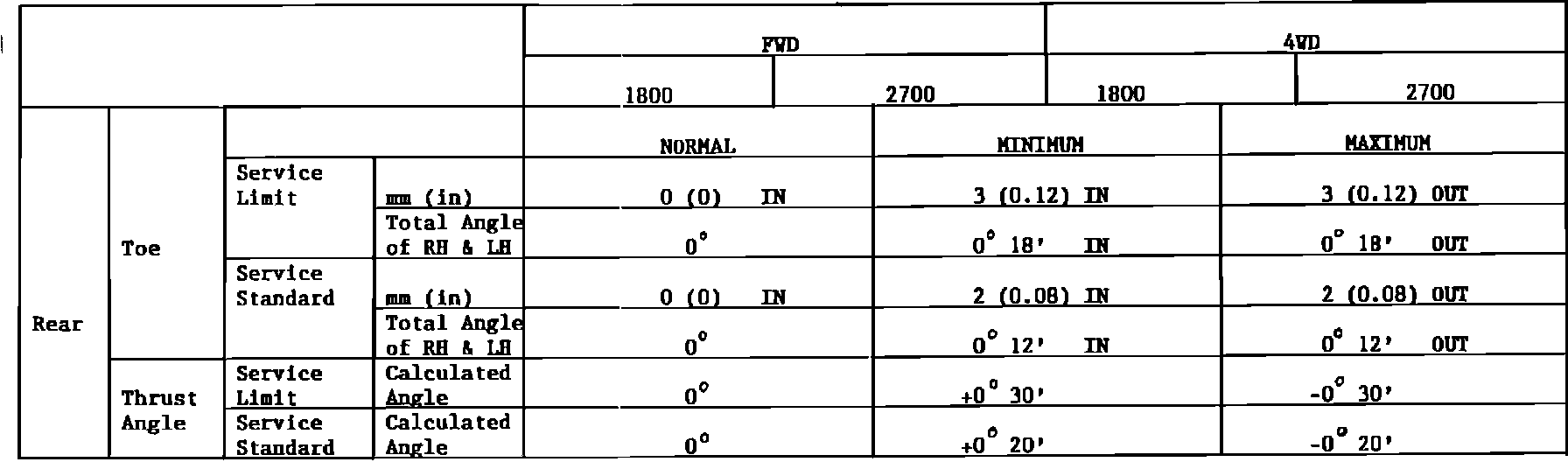 USE THIS CHART TO UPDATE THE FIGURE FOR "WHEEL ALIGNMENT SPECIFICATIONS" IN THE APPLICABLE SERVICE MANUAL.