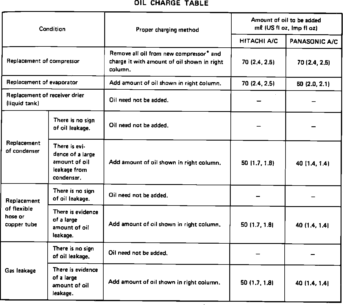 Refer to oil charge table in Fig. 6 when servicing the air conditioning system for oil replacement quantities.