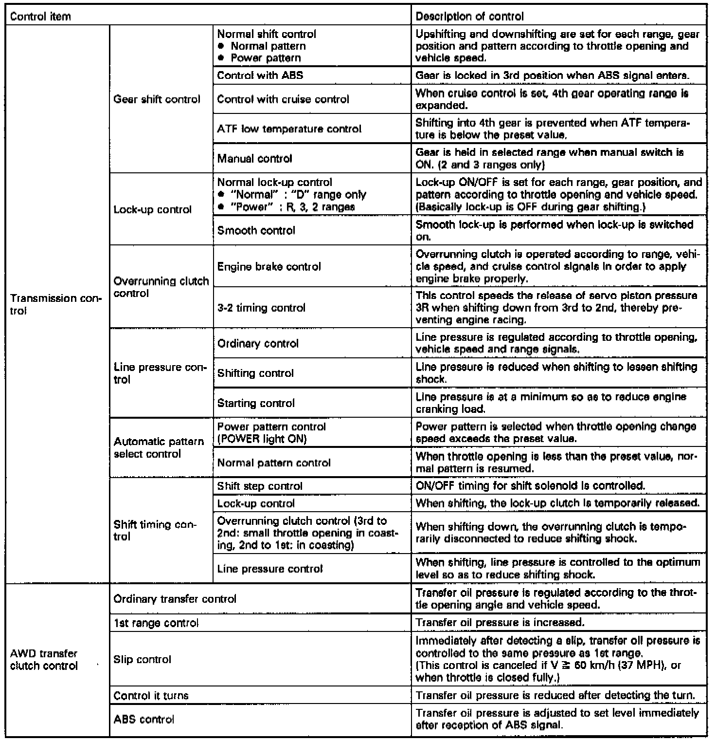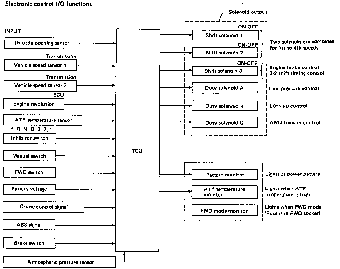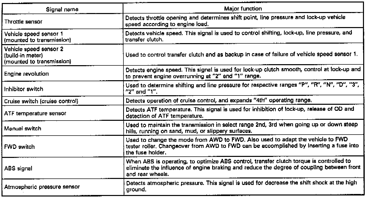 The electronic-hydraulic control system consists of various sensors and switches, a transmission control unit (TCU) and the hydraulic controller including solenoid valves. The system controls the transmission proper including shift control, lock-up control, overrunning clutch control, line pressure control, auto pattern select control and shift timing control. It also controls the AWD transfer clutch. In other words, the system detects various operating conditions from various input signals and sends output signals to shift solenoids 1, 2 and 3 and duty solenoids A, B and C (a total of six solenoids).