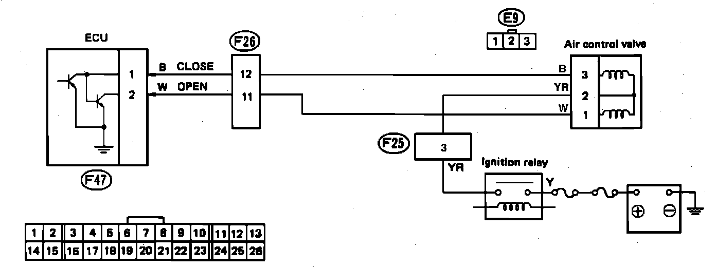 With ignition "ON," measure voltage between air valve connector terminal (E9)2 and ground. It should read 10V minimum.