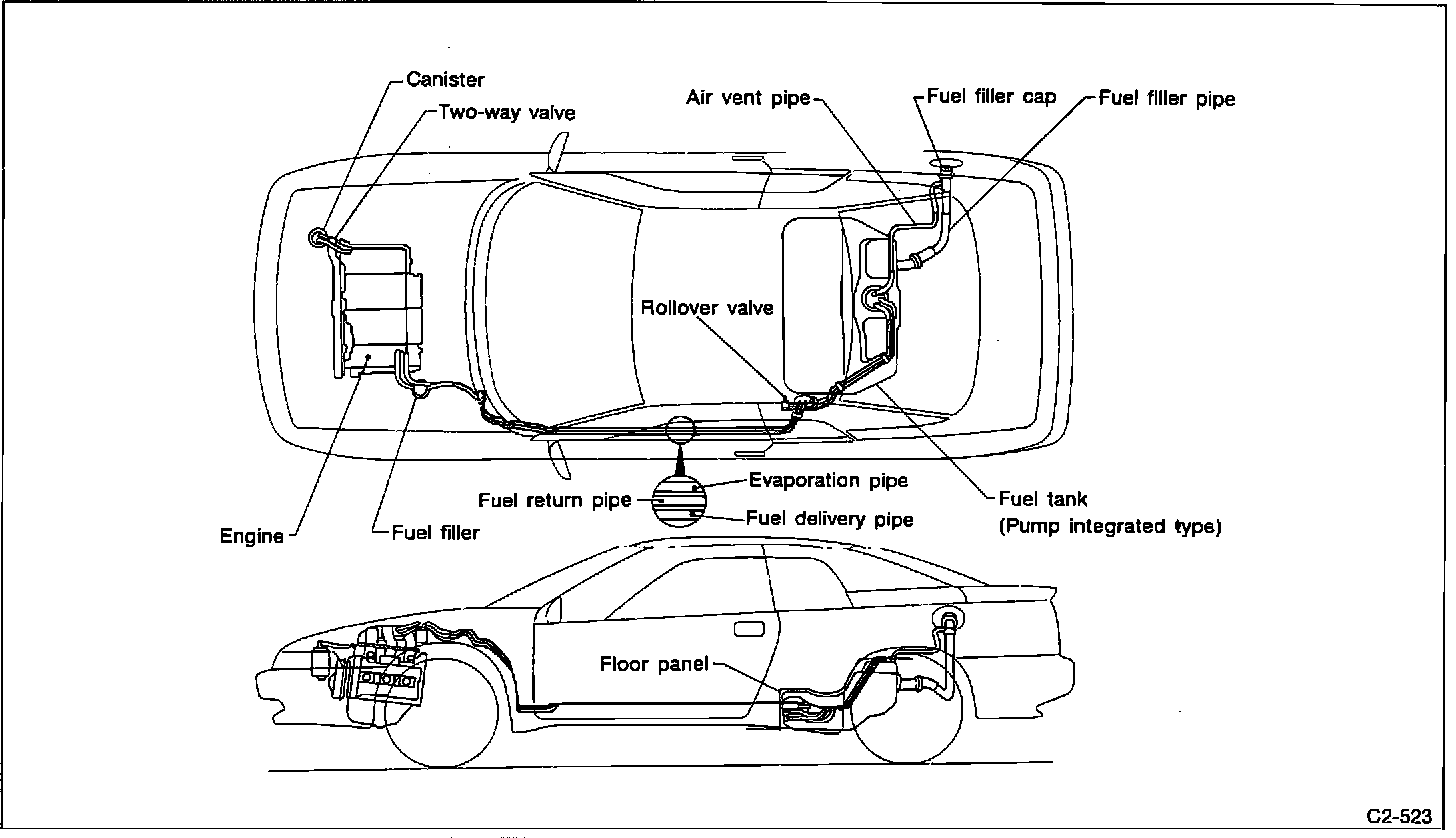 2. From under the vehicle, detach fuel deliver and return hoses, evaporation tube and two-way valve.