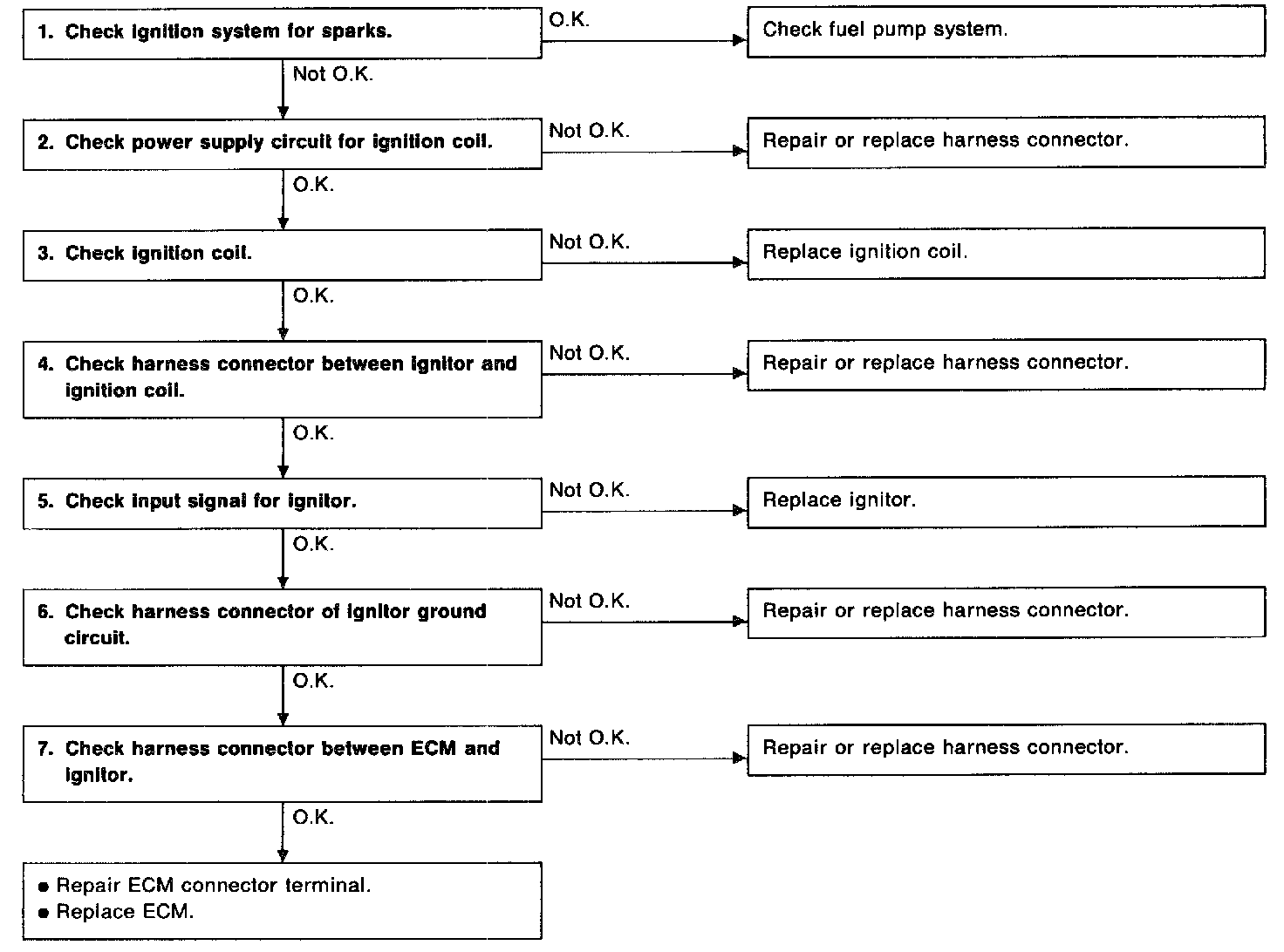 7. CHECK HARNESS CONNECTOR BETWEEN ECM AND IGNITOR.