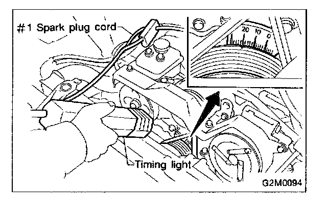1. Warm-up the engine.2. To check the ignition timing, connect a timing light to #1 cylinder spark plug cord, and illuminate the timing mark with the timing light.