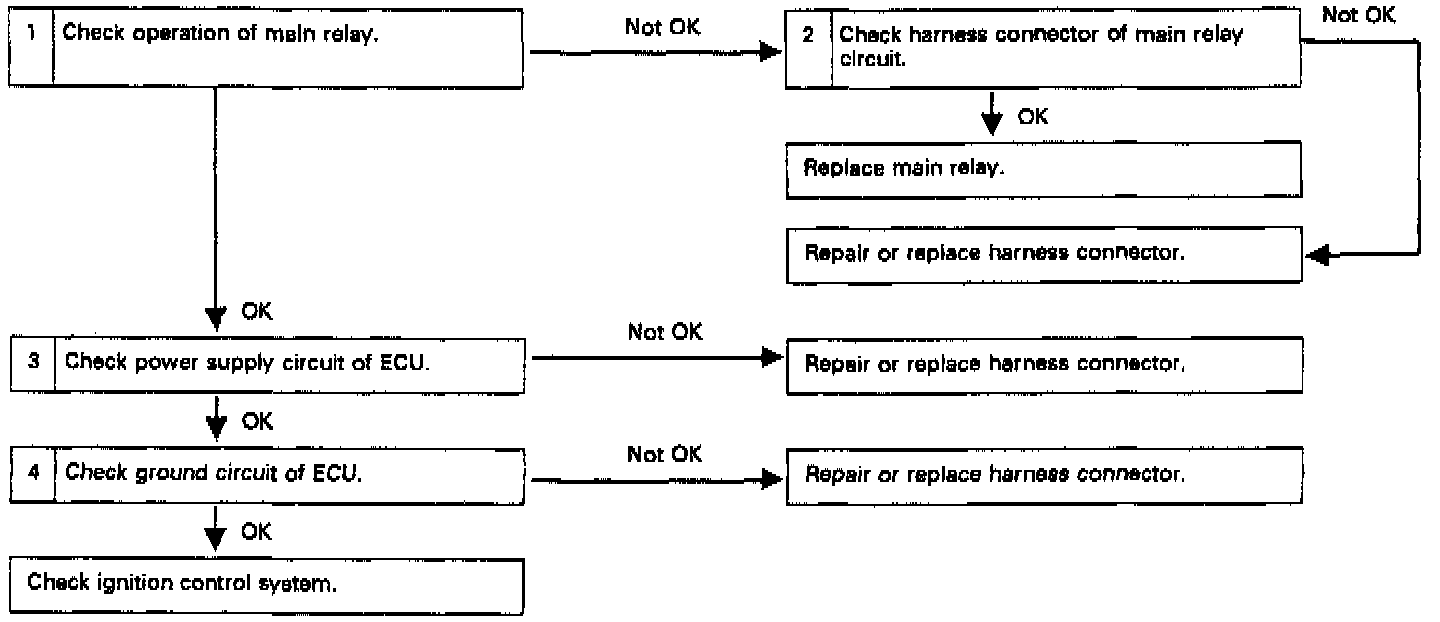 Turn ignition switch "ON" or "OFF" and check for main relay operating sound.
