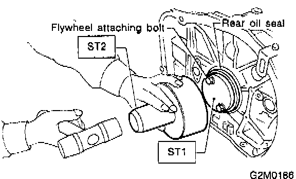 28. Coat outside surface of rear seal with engine oil, and seal lip with grease, then install oil seal using a suitable tool.