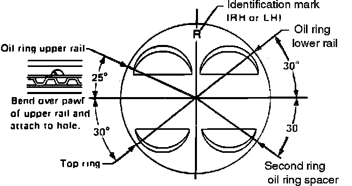 25. Install piston rings onto pistons, positioning end gaps as shown, Fig. 40 and 41. After installation, bend pawl of upper oil ring rail upward and attach to hole in piston.