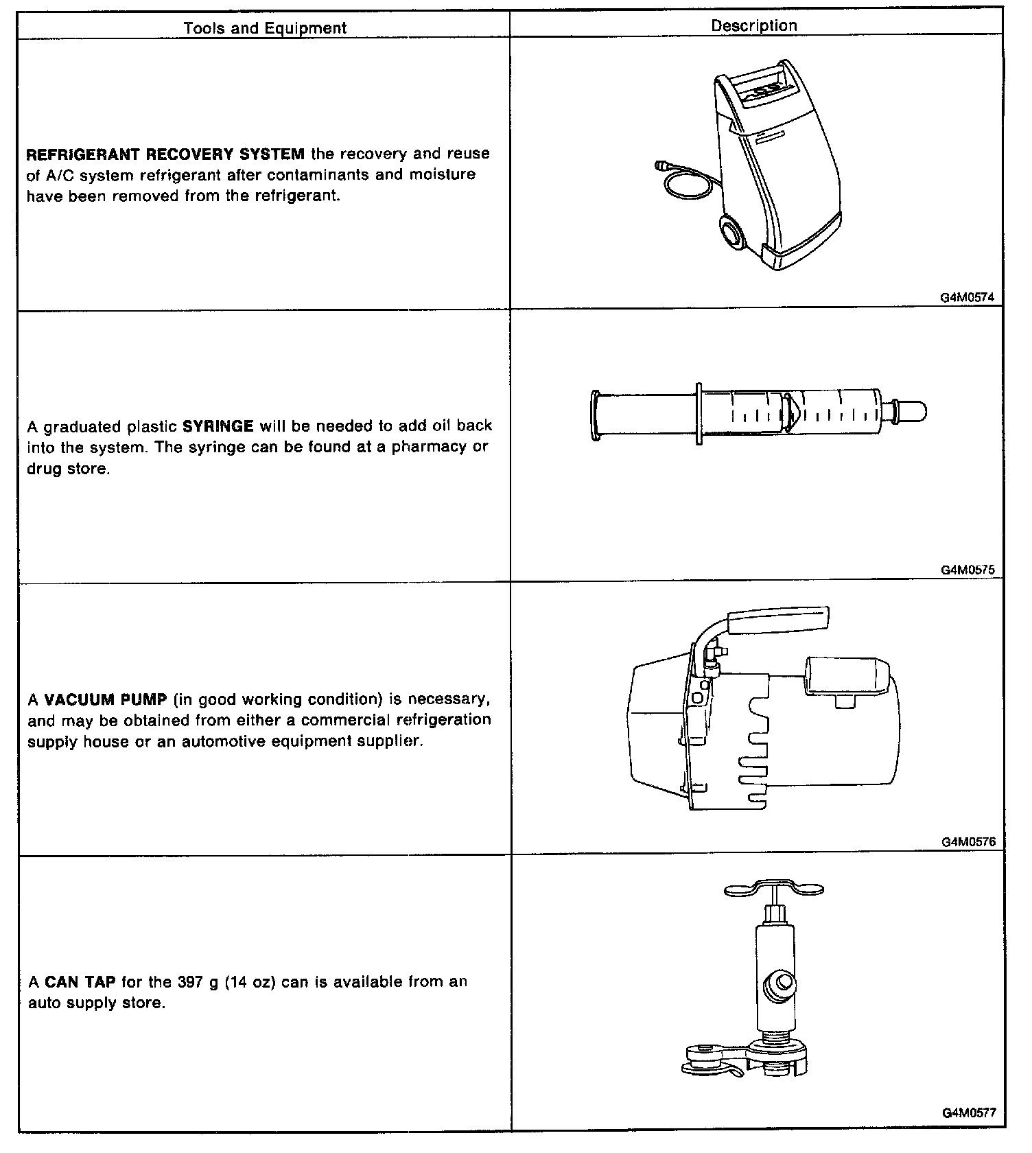 This section provides information about the tools and equipment that will be necessary to properly service the A/C system.