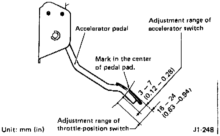 Switch must turn ON within a range from 3 to 7 mm (0.12 to 0.28 in) from the released position of the accelerator pedal.