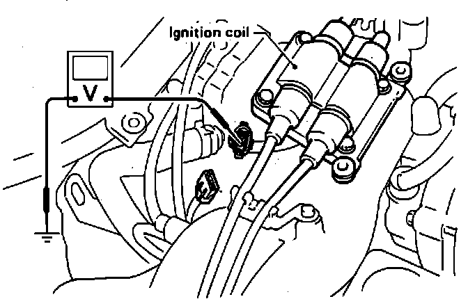 With ignition "ON," measure voltage between coil "+" terminal (E10)2 and ground. It should read 10V minimum.