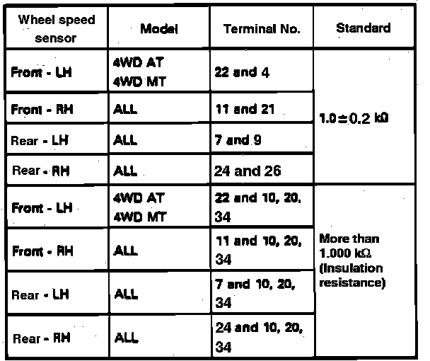 2. Measure resistance between speed sensor terminals. Refer to Fig. 34 for specifications. If resistance is not within specifications replace wheel sensor or adjust gap between sensor and tone wheel.