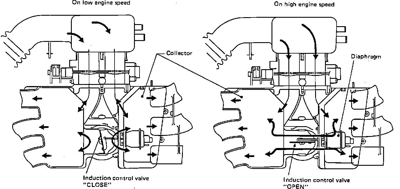 During high engine speed a long intake path is desirable. A long intake path increases engine horsepower. During high engine speeds the ECU energizes the control solenoid, allowing vacuum stored in a tank to act upon the actuator diaphragm. Vacuum moves the diaphragm which in turn opens the induction control valve. When the valve opens, it connects the two halves of the intake collector together. Intake air is allowed to flow from both throttle bores to the cylinder that has the most vacuum (intake stroke). Since some of the air flows from the corresponding throttle bore to the cylinder and part from the opposite one, the intake air path is increased.