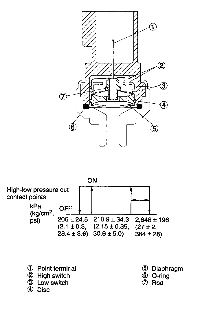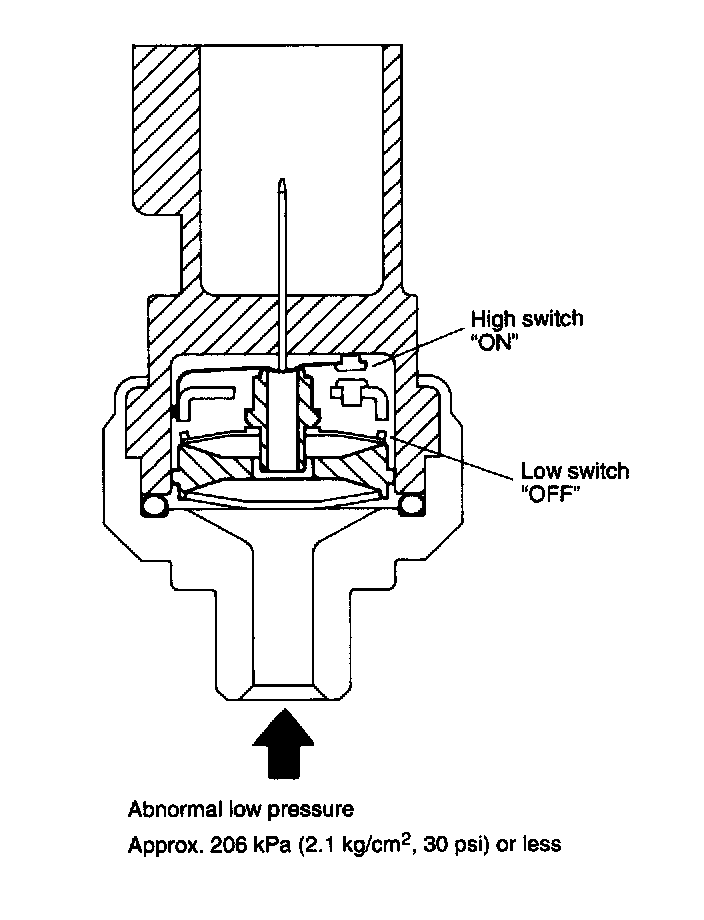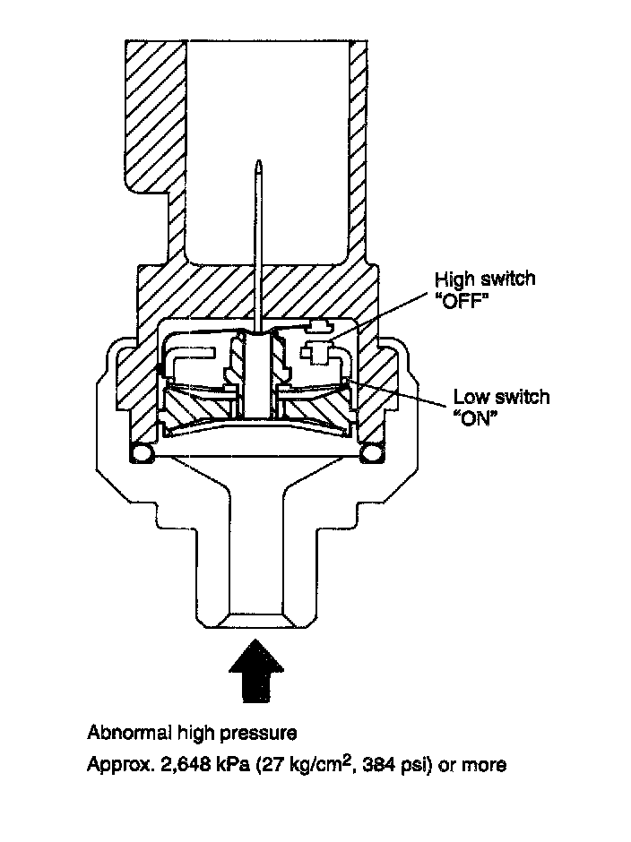 When refrigerant pressure is greater than 2,648 kPa (27 kg/sq.cm, 384 psi), diaphragm spring is inverted so that high switch is opened (OFF) and low switch is closed (ON).