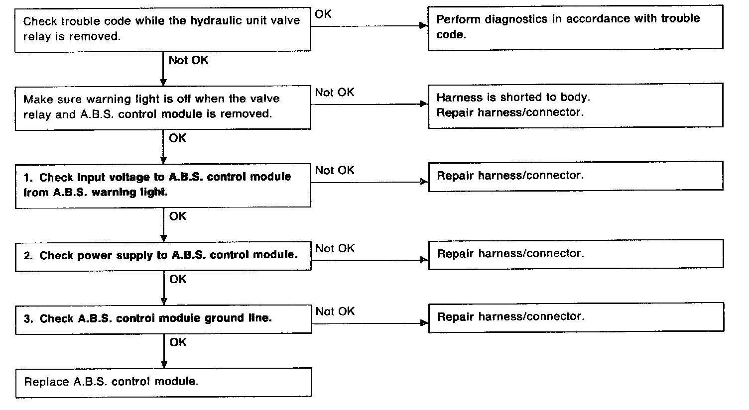 1. CHECK INPUT VOLTAGE TO A.B.S. CONTROL MODULE FROM A.B.S. WARNING LIGHT.