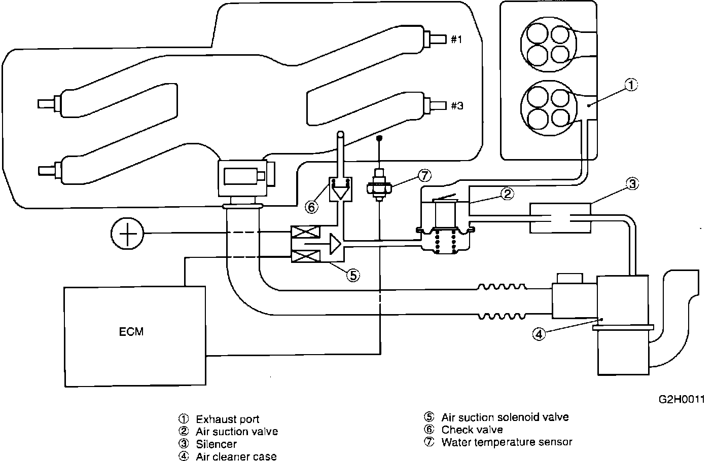 The secondary air induction system leads air from the air cleaner directly into the exhaust so as to promote complete combustion of the exhaust gas in the front catalyst, lowering hydrocarbons (HC) and carbon monoxide (CO). The system consists of the following components: