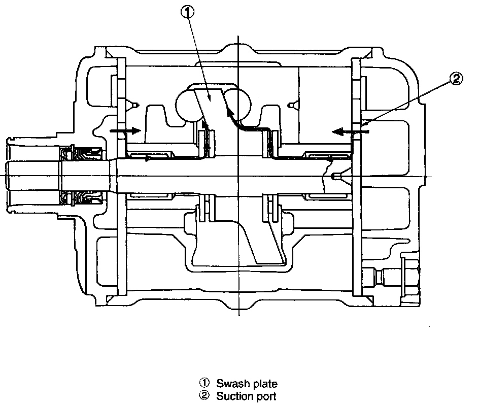 - The oil is diffused by the negative pressure which is produced when the low pressure refrigerant gas passes through the suction port of the valve plate at a high speed.