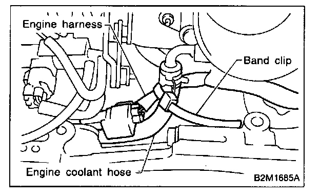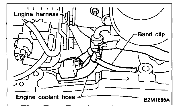 3. Remove band clip which fastens engine harness to engine coolant hose.